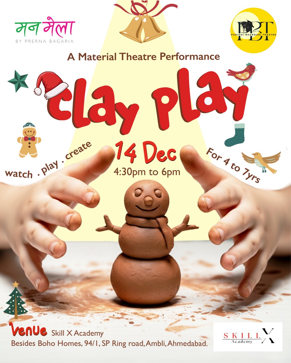 On stage, a curious character discovers a simple ball of clay β€” and what happens next is a mystery. Is it alive? Does it have a mind of its own? Tiny elves, twinkling trees, gingerbread friends, fluttering birdies… or even Santa himself might appear in this playful, music-filled, movement-packed performance! πŸŽ…βœ¨