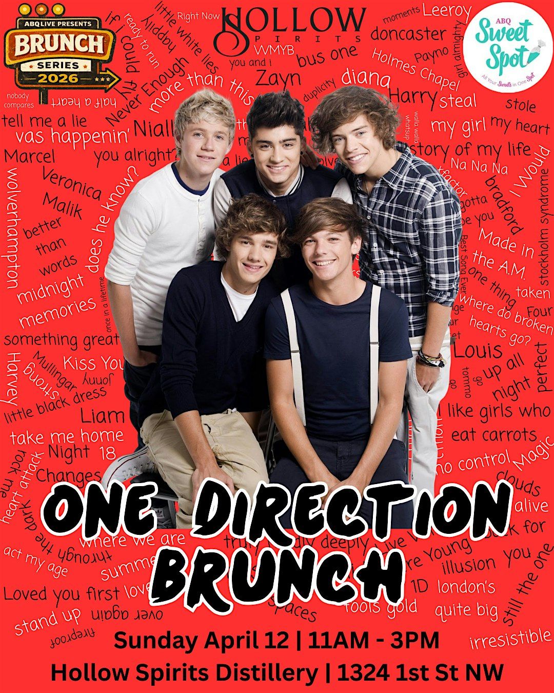 - **Event Description**: Dust off your skinny jeans and grab your best mates because we are hosting the ultimate One Direction Brunch!About this Event✨ Does it ever drive you crazy just how fast the night changes? ✨Don’t worry, we’re bringing those memories back to life! Dust off your skinny jeans and grab your best mates because we're teaming up with Hollow Spirits Distillery are hosting the ultimate One Direction Brunch.Whether you’re a "Up All Night" veteran or you still have a "Midnight Memories" poster hidden in your closet, this is the story of your life you won't want to miss. We’re transforming the distillery into a 1D paradise filled with nostalgia, themed treats, and all the tracks that made you a Directioner.🕒 The DetailsWhen: Sunday, April 12th | 11AM – 3PMWhere: Hollow Spirits Distillery | 1324 1st St NWVibe: 100% Niall, Zayn, Liam, Harry, and Louis.🥂Vas Happenin’?Best Song Ever Playlist: A non-stop mix of deep cuts and chart-toppers. Yes, we will be screaming the "Best Song Ever" bridge.Themed Spirits: Sip on specially crafted cocktails and mocktails inspired by the boys.1D Trivia: Think you know the boys better than anyone else? It’s time to prove you aren't just a casual listener. We’ll be hosting One Direction Trivia throughout the brunch with prizes that are better than a follow from Niall on Twitter (okay, maybe second best).Sweet Spot Treats: Indulge in some "Irresistible" food from ABQ Sweet Spot.Photo Ops: Wear your favorite era! Whether you’re rocking the 2011 suspenders or the 2013 frat boy era, come ready for the ‘gram. You'll even get a free print from our photobooth!It’s "Gotta Be You" and your crew! Tickets are limited, so don't be the Last to grab yours. Let’s make some new memories and party like it's 2012 all over again.