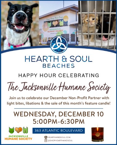 Hearth & Soul Beaches invites the community to lend a paw in support of the Jacksonville Humane Society. The Atlantic Beach boutique has thoughtfully created a gathering space where guests can explore thoughtfully-curated collections of simple, modern, and classic pieces for themselves, their homes, or someone special. From 5 p.m. to 6:30 p.m. on Wednesday, Dec. 10, Hearth & Soul will host a public celebration to learn about the Jacksonville Humane Society. 100% of the net profits from the sale of the Hearth & Soul signature Hearth Candle will benefit the Jacksonville Humane Society through the end of the year.Â