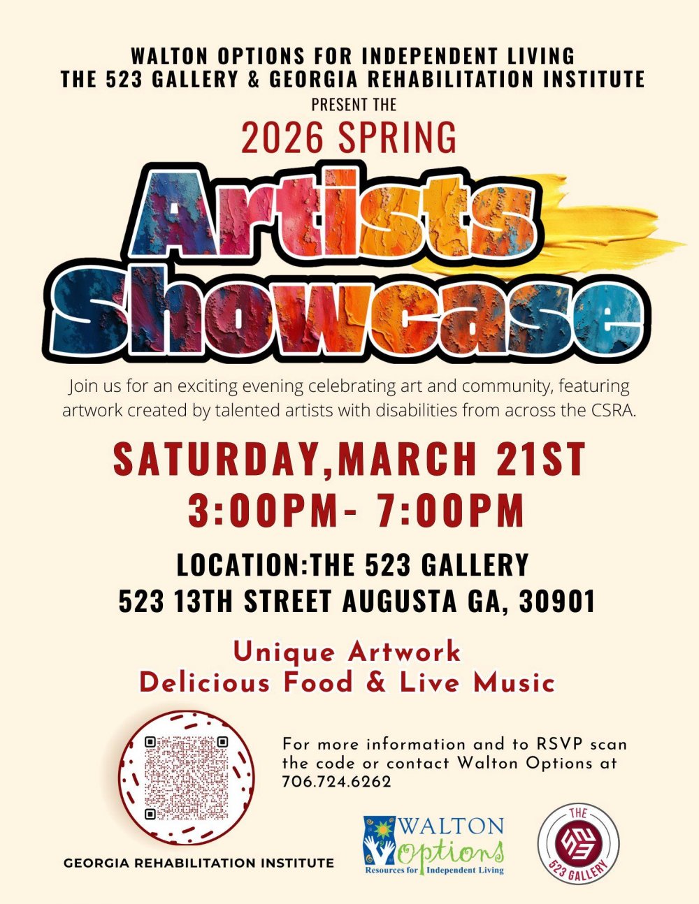 Evening filled with creativity, showcasing artwork created by talented artists with disabilities *Unique Artwork * Delicious Food *Live Music and more To RSVP fill out the form below or contact Walton Options at 706.724.6262