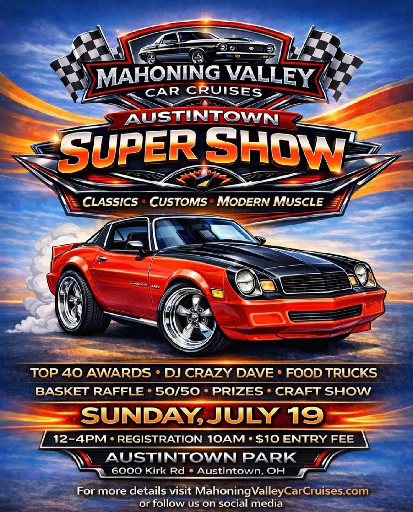 The Austintown Super Show will feature hundreds of classic cars, custom builds, hot rods, trucks, and modern muscle filling the park for a full day of horsepower, community, and family fun.
