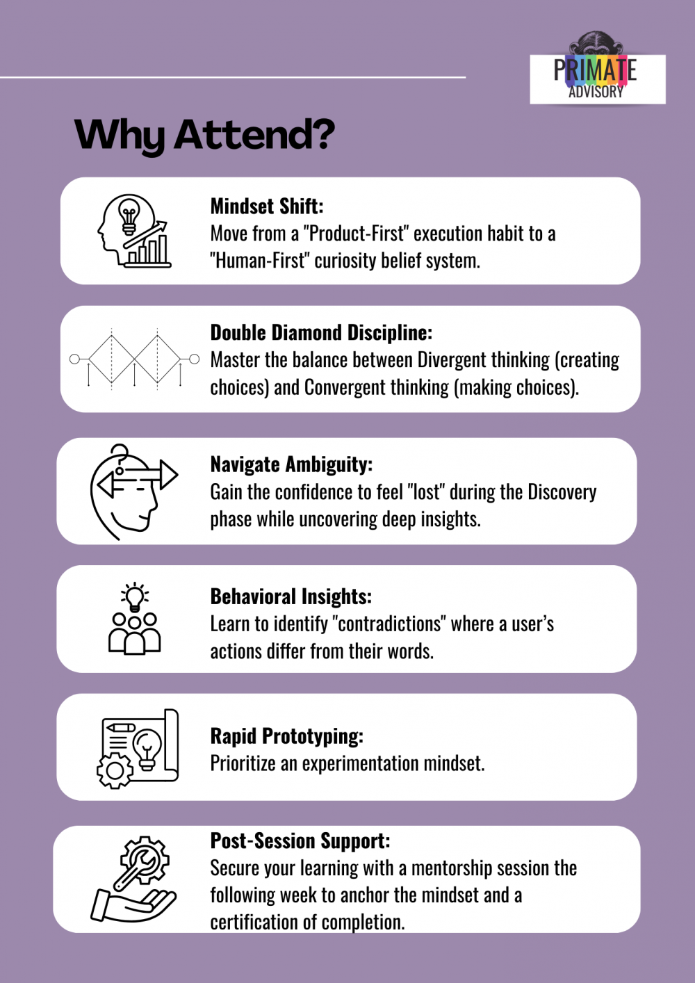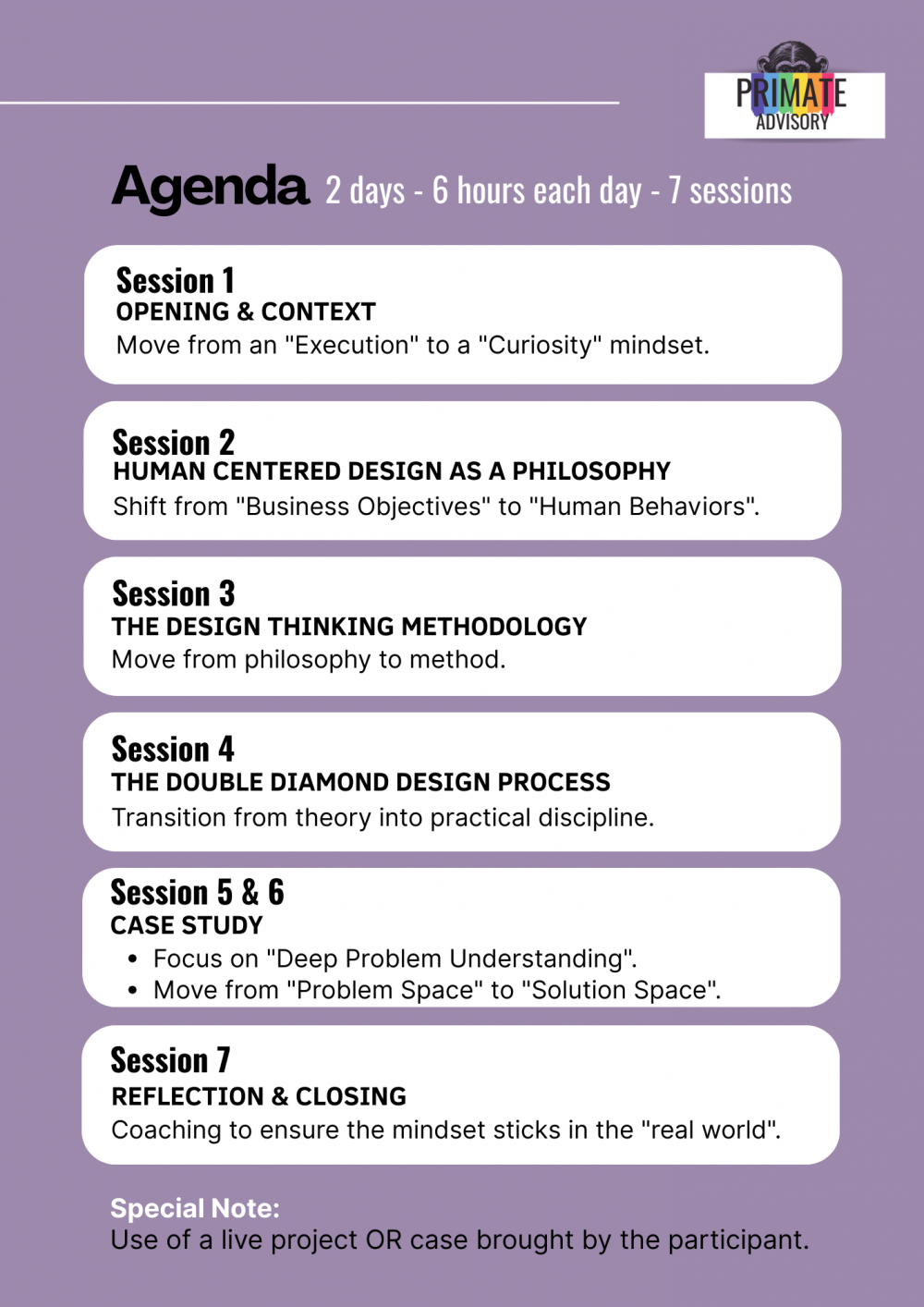 The journey begins by shifting your mindset from a "Product-First" execution style to a "Human-First" curiosity mindset. Throughout the day, you will move from the philosophy of HCD to the discipline of the Double Diamond, concluding with practical application through hands-on case work.