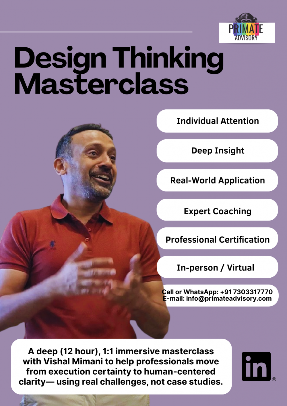 Elevate your design practice from a general understanding to a focused, expert-led mastery. This Design Thinking Masterclass is a personalized, one-on-one (1:1) session led by expert Vishal Mimani spread over 2 days (6 hours each day, total 12 hours). Designed for those who want to move beyond generic workshops, this intensive day provides individual attention and deep insights into the human-centered design (HCD) belief system.