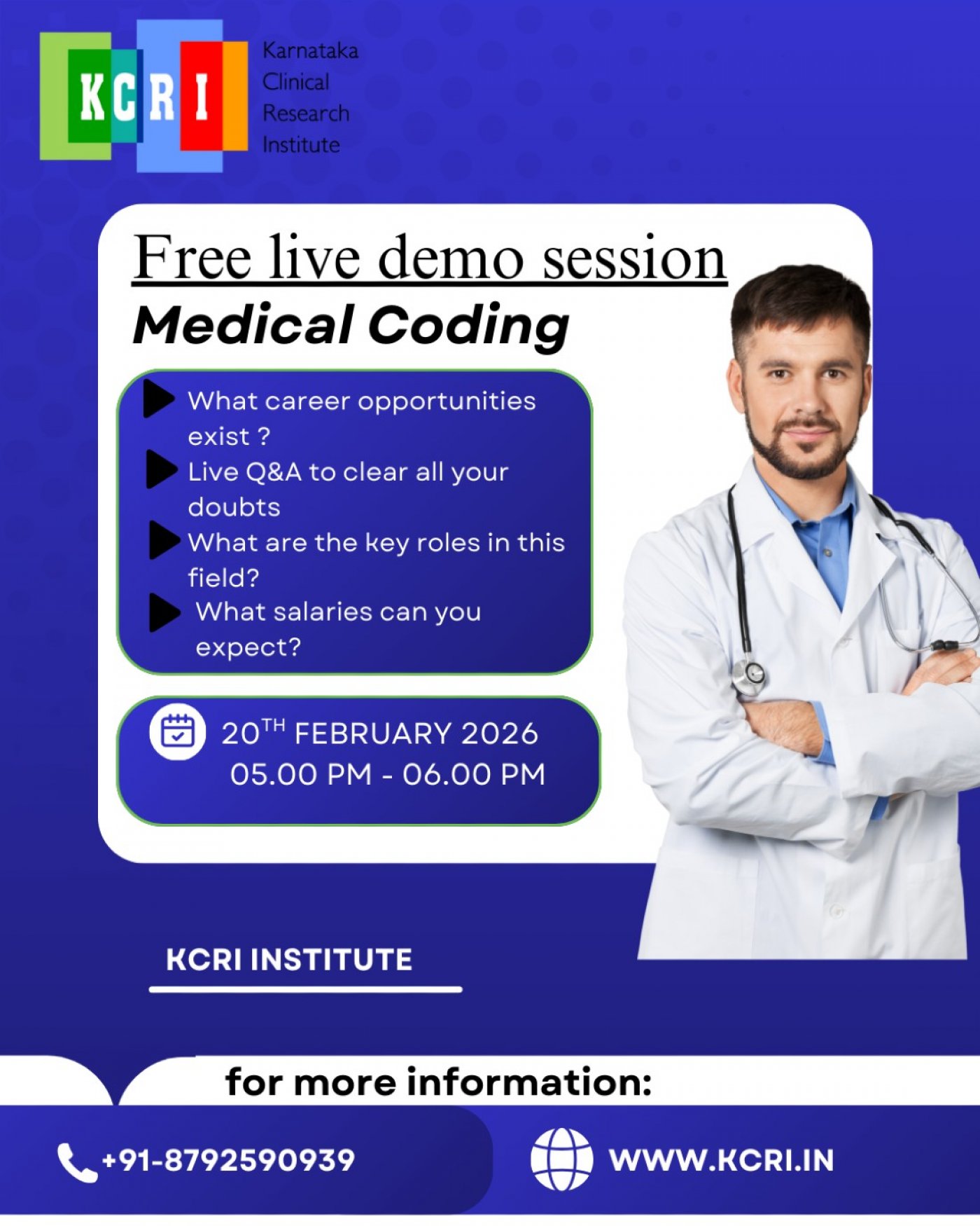 Unlock the door to a rewarding and fulfilling career in healthcare – one code at a time. Join us at the Medical Coding Live Demo Session and let your curiosity lead the way. Experience the future of healthcare documentation with KCRI Bangalore