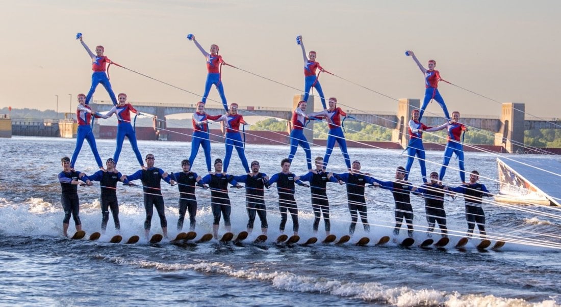 We are Ski Bellevue Bellevue’s own water ski show team. We are one of only four water ski show teams in Iowa and the only one to perform on the Mississippi River! Come and check us out north of Lock and Dam 12 for practice or south for any one of our shows. All shows are free (donations are certainly appreciated)! Great family entertainment with bare-footing jumping human pyramids glittery costumes great music and powerful towboats. Ski Bellevue is always looking for new members of all ages and skill levels. You can join us as a water skier boat and safety crew member show announcer and much more!