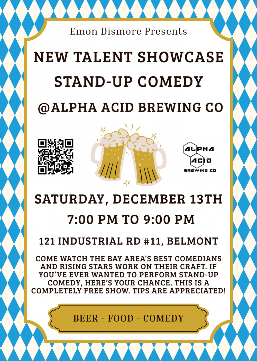 This comedy show is hosted & produced by Emon Dismore. Emon Dismore is an up & coming Bay Area comedian who's "Man on the Street" style interviews has amassed over 40 million views across instagram alone. Follow @emondismore if you're a fan of comedy and want to stay updated on future events. Come and watch some of the top local comedians while enjoying the best beer in the Bay Area. Join me in this night that will be full of fun and laughter!