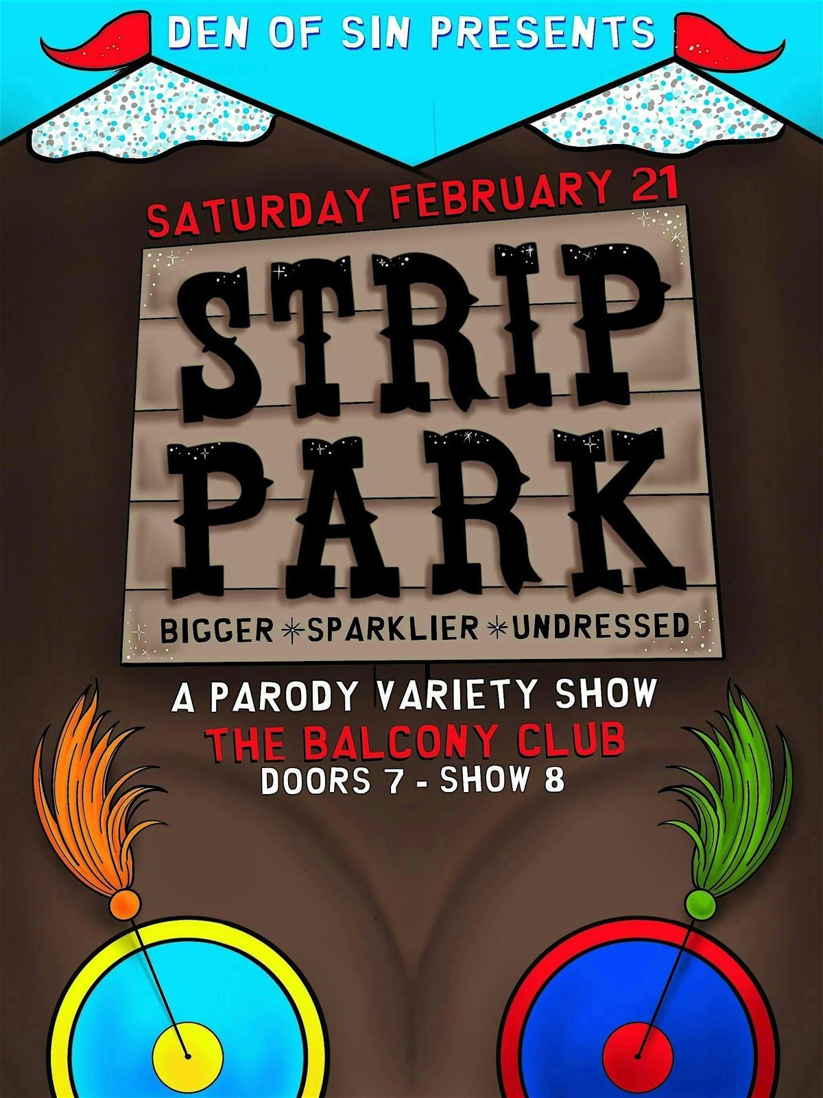 - **Event Description**: We’re goin down to Str!p Park, gonna have ourselves a time.About this EventDen of Sin is back to kick off 2026 with an all-new nerdy parody spectacular: Str!p Park.It’s bigger. It’s sparklier. It’s undressed.Join us January 21 at The Balcony for a burlesque and drag variety show inspired by the outrageous world of South Park—reimagined. With more sparkles. Nothing is sacred and EVERYTHING comes off. Expect bold characters, absurd humor, over-the-top performances, and just enough chaos to make your parents uncomfortable.  It's easy, mmmkay?