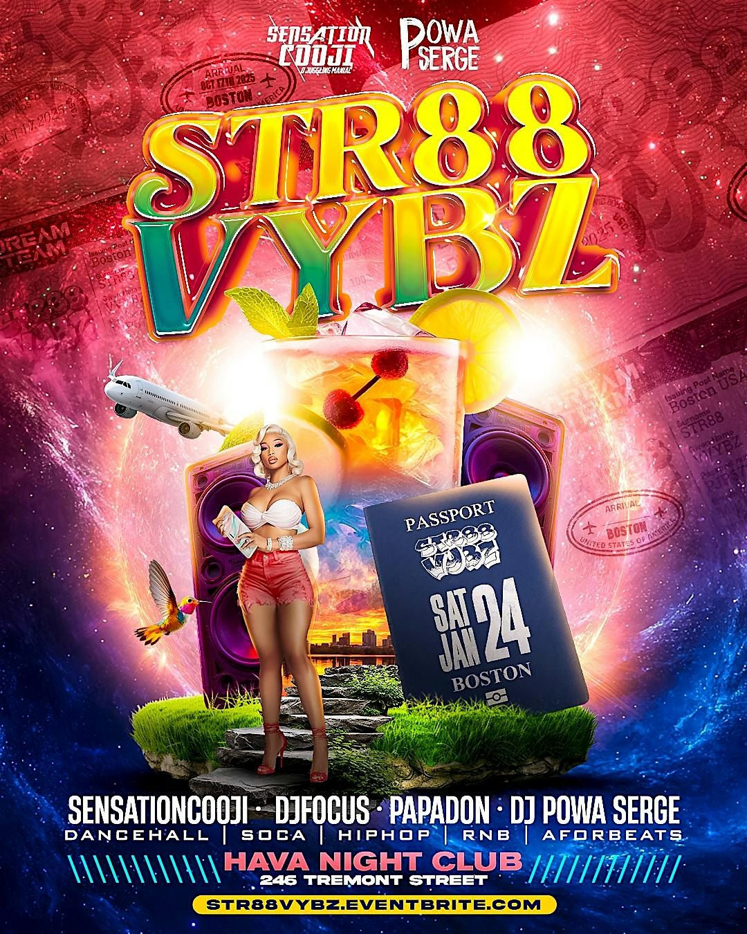- **Event Description**: Get ready to dance the night away with the best Caribbean, Hip-Hop, and Afrobeats at this lit party!About this Event✈️? STR88 VYBZ HAS LANDED IN BOSTON ?✈️Pack your passport and grab your crew — we’re taking your Saturday night straight to the islands ??From Dancehall &amp; Soca to Hip-Hop, R&amp;B &amp; Afrobeats, this is a full-flavor, high-energy international party experience.?? Beautiful people? Heavy bass, nonstop vibes? Drinks flowing all night? One night, every culture, pure energy? Powered by SensationCooj, DJ Focus, DjPapadon &amp; DJ Powa Serge? HAVA Night Club – 246 Tremont St, Boston? Saturday, Jan 24This is not just a party — it’s a destination.Pull up dressed to impress and ready to move.?️ Tickets moving fast — secure yours now before takeoff.#STR88VYBZ #BostonNightlife #IslandVibes #SaturdayNightEnergy #PassportRequired  https://cdn-az.allevents.in/events6/banners/aa09c480-df2b-11f0-91ad-252c3bcf1605-rimg-w592-h740-dc020731-gmir.jpg