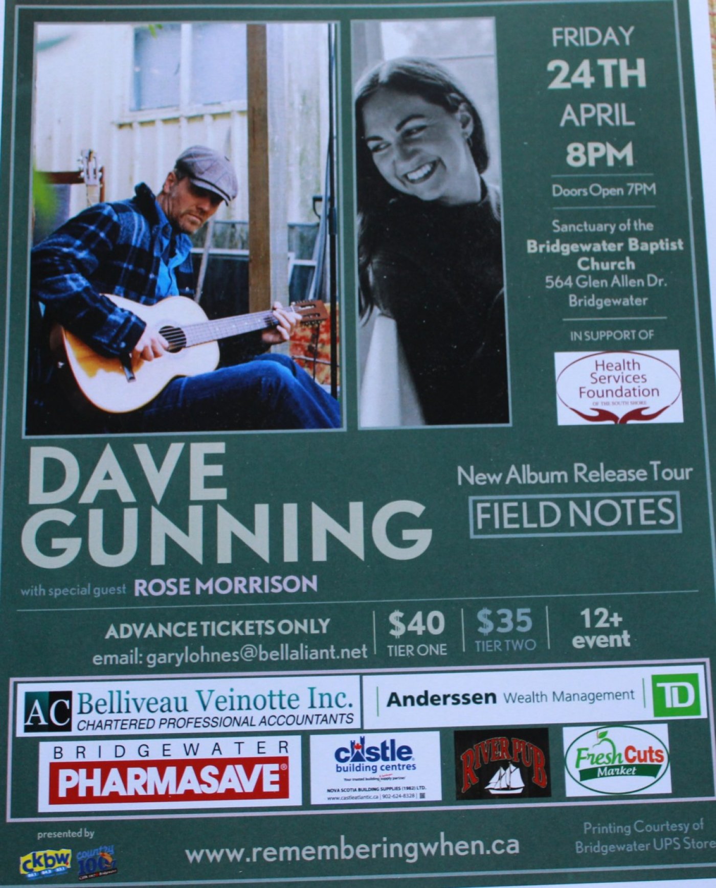 Fundraising event in support of the Health Services Foundation of the South Shore. A musical concert featuring Dave Gunning singing the songs from his new album "Field Notes".