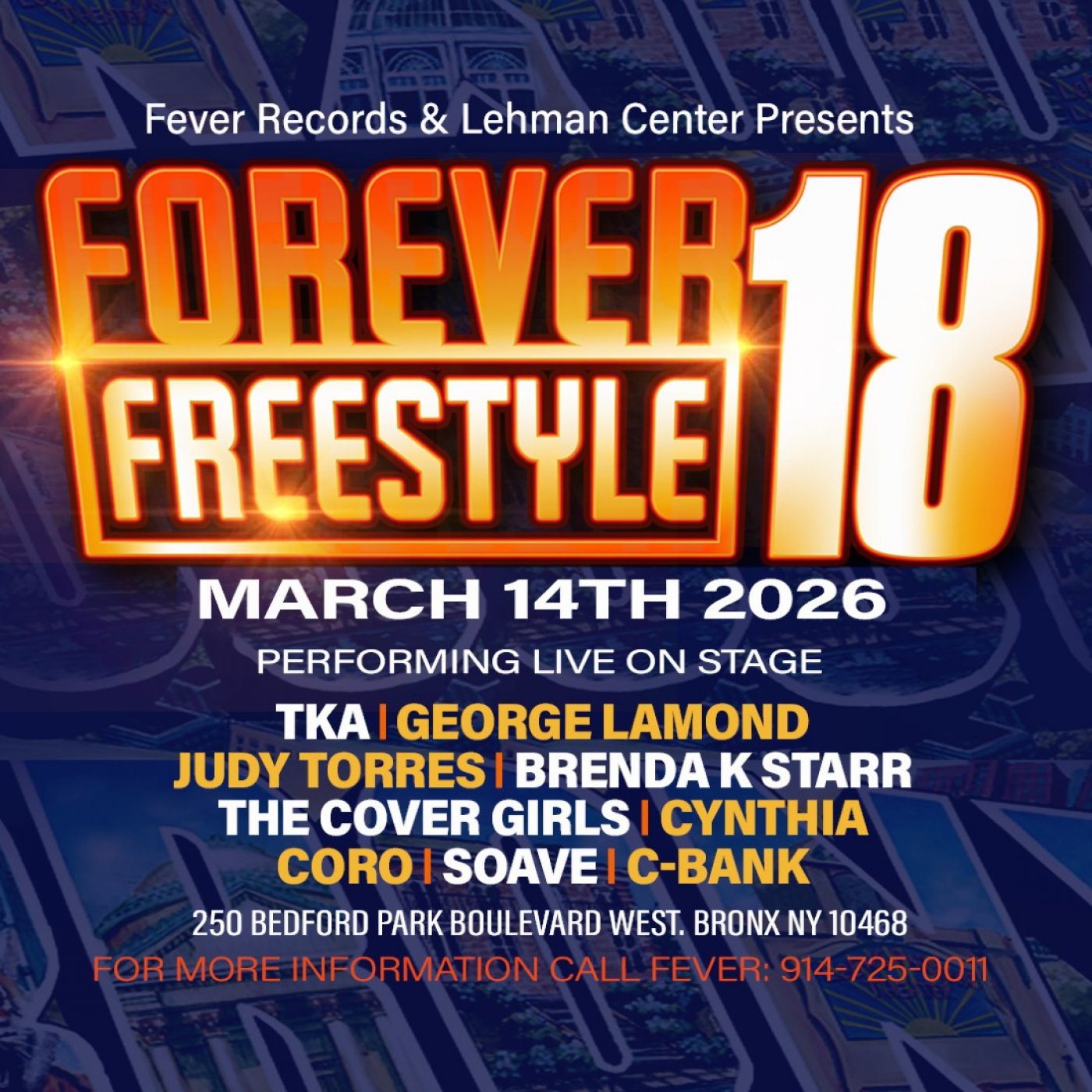 An electrifying concert filled with the best of R&B. Hosted by Sal Abbatiello and Speedy, with music by Dj Lucho and Dj WhiteBoy KYS. This concert will feature high-energy performances by TKA, George LaMond, Judy Torres, Brenda K Starr, The Cover Girls, Cynthia, Coro, Soave, and C-bank that will make sure to get you grooving.