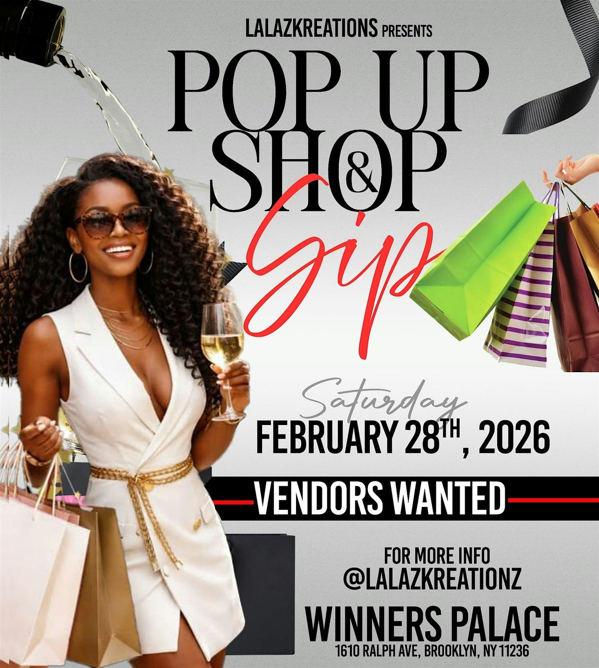 - **Event Description**: Get ready to shop 'til you drop and sip on some tasty drinks at our POP UP SHOP &amp; SIP event - it's going to be a blast!About this EventWelcome to the POP UP SHOP &amp; SIP event at Winners Palace Event Hall! Join us on February 28, 2026 at 1:00 PM (Eastern Time) for a night of shopping and sipping. Browse through unique pop-up shops while enjoying delicious drinks. Don't miss out on this exciting opportunity to discover new products and have a great time with friends. See you there!  https://cdn-az.allevents.in/events2/banners/250b56a0-f9f1-11f0-8530-913913406605-rimg-w663-h740-dcc0c0c0-gmir.jpg
