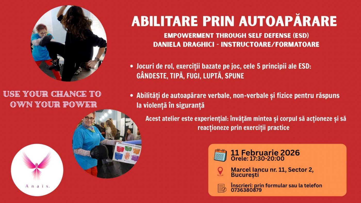 Dear Empowerment through Self Defense enthusiasts in Bucharest, here is information about the next workshop I will be conducting at the ANAIS Hub Association on February 11, from 5:30 p.m. to 8:00 p.m., at 11 Marcel Iancu Street.