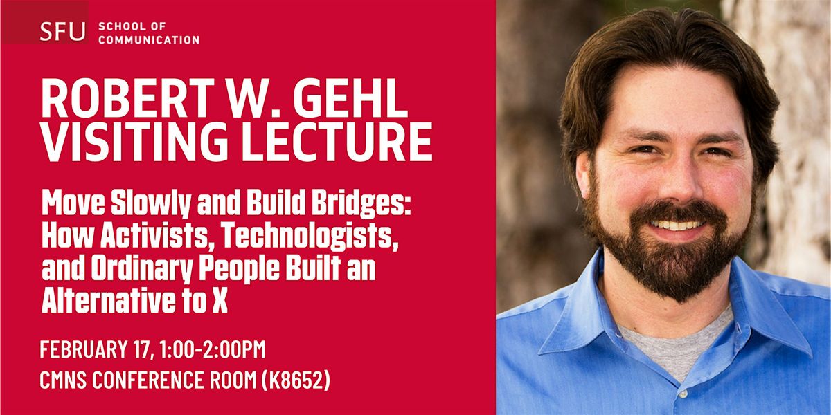 - **Event Description**: "Move Slowly and Build Bridges: How Activists, Technologists, and Ordinary People Built an Alternative to X".About this EventPlease join us for "Move Slowly and Build Bridges: How Activists, Technologists, and Ordinary People Built an Alternative to X", a visiting lecture by Robert W. Gehl. Lunch and refreshments will be provided so please RSVP.Location: CMNS Conference room (K8652)Date: February 17thTime: 1:00pmIn his new book Move Slowly and Build Bridges, Robert W. Gehl tells the story of the activists, software developers, artists, and everyday people who have built the fediverse, a noncentralized alternative social media system. Unlike big tech corporations like Facebook, TikTok, or X, the fediverse is comprised of thousands of small, independent communities who use a Web protocol to communicate with one another. These small communities govern themselves and moderate content at the human scale — compare that to Facebook and X, which try to moderate global conversations. And the fediverse isn’t built in order to gather user data and sell attention to marketers — it’s a more privacy-respecting social media alternative. Making a noncentralized, ethically run social media system isn’t easy. The people building the fediverse have faced long hours, burnout, angry debates, and, worst of all, bigotry, death threats, and discrimination. They face constant, nagging doubts: Can we really do this? Can noncentralized social mediasurvive in a world that is used to corporate social media? Can we—all of us—have our own social media? As Move Slowly and Build Bridges shows us, the answer is yes, but it’s going to take a struggle.