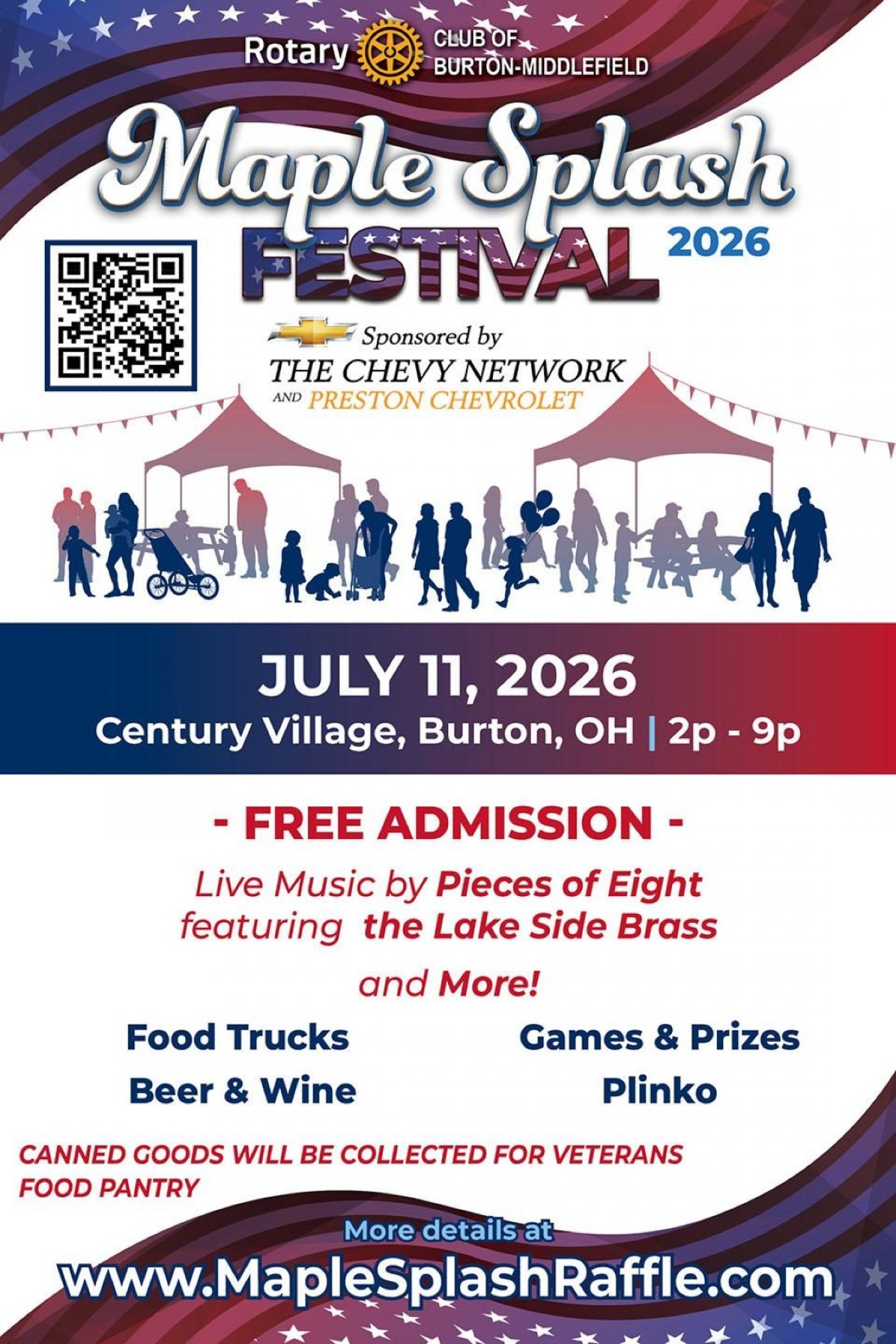 Join us for the Maple Splash Festival at Century Village Museum for the excitement of live bands: Pieces of Eight and the Lakeside Brass , food trucks -Wheely Good Food; Dilly Dilly Donuts CLE and more; games, a huge Chinese auction, Beer tent and of course, the Maple Splash Raffle where we will be giving away a 2025 Chevy Silverado 1500 Crew 4WD cab truck and other great prizes!! Bring your lawn chairs and friends and spend the day with The Rotary Club of Burton Middlefield while we raise funds to support our community. We will also be collecting non-perishable items such as canned goods and paper products for the Geauga Veteran's Food Pantry. Come have some fun!!