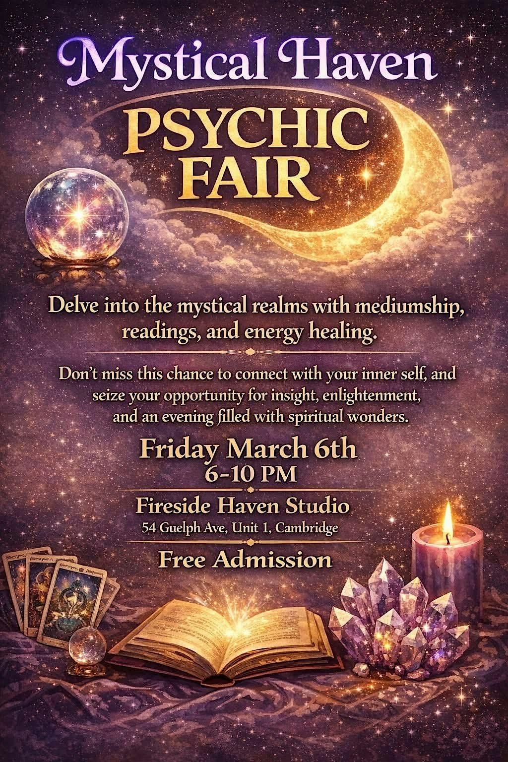 - **Event Description**: Delve into the mystical realms with mediumship, readings, and energy healing.About this EventUnlock the mysteries of your future at the Mystical Haven Psychic Fair.Delve into the mystical realms with mediumship, readings, and energy healing.Our event boasts a vibrant array of vendors offering their services and products.Don't miss this chance to connect with your inner self, and seize your opportunity for insight, enlightenment, and an afternoon filled with spiritual wonders.Free AdmissionFireside Haven54 Guelph Ave, Unit 1Cambridge.Entrance to studio is in back parking lot.