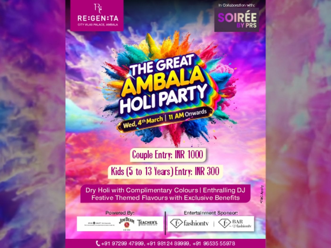 Gear up for the “THE GREAT AMBALA HOLI PARTY” at REGENTA CITY VILAS PALACE, AMBALA by ROYAL ORCHID HOTELS. Celebrate a Dry Holi with Vibrant Hues, Thumping Music, Delights with Exclusive Benefits and more brought to you by FBar by FTV as Entertainment Sponsor, Soirée by PRS as Event Collaborator and powered by Drink Smart, Jim Beam Club Soda and Teacher’s Packed Drinking Water.