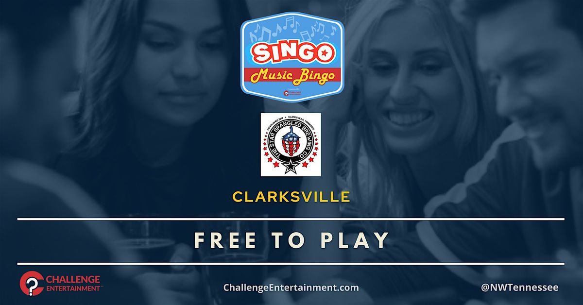- **Event Description**: Weekly SINGO Music Bingo Nights at Star Spangled Brewing Co - ClarksvilleAbout this EventCLARKSVILLE - NEW CE GAME NIGHT #FREEJoin us for fantastic evenings out with our #SINGO Music Bingo at The Star Spangled Brewing Co. (Main Brewery) Every FRIDAY at 7:00PM. Starting weekly on 11/21!Hosted by Challenge Entertainment, it's your chance to win prizes with every round while grooving to 150 of the best hits in the music business. Get ready for mini concerts featuring your favorite bands and artists, plus the opportunity to snag house cash! Sing along if you'd like, have a blast, and it's all absolutely free to play!!#NWTennesseeTrivia powered by ChallengeEntertainment.com for a #BetterNightOut#Free The Star Spangled Brewing Co. #MusicBingo #BingoInClarksville #BingoNearMe #FridayBingo #WhatToDoTonight #YourThirdSpaceThe Star Spangled Brewing Co. -  614 N. Spring St., Clarksville, TN