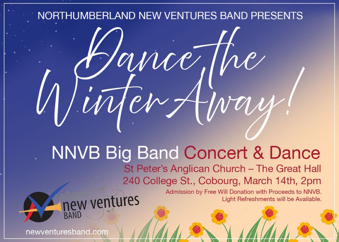 Escape the winter blahs and look forward to Spring at our annual Big Band Bash! Hear the great sounds of the New Ventures Big Band, conducted by David Marshall, as you take to the dance floor and burn those winter calories away! The show starts at 2 pm. in the GREAT HALL at St. Peter’s Anglican Church. Admission is by “free will” donation, with proceeds to support the Northumberland New Ventures Band. Light refreshments will be available. Be there!