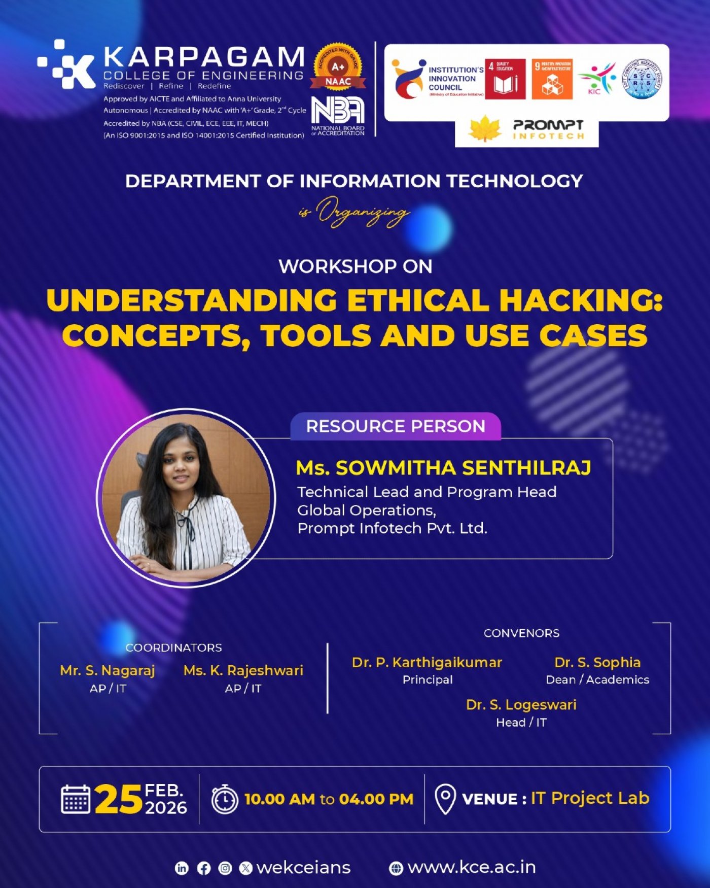 The main objective of the one-day workshop on “Understanding Ethical Hacking: Concepts, Tools and Use Cases” is to motivate the participants to understand the importance of ethical hacking and cyber security in protecting digital systems and information. The workshop aims to provide fundamental knowledge about ethical hacking concepts, common cyber threats, vulnerabilities, and attack techniques, and how these can be identified and prevented using security tools and methodologies.