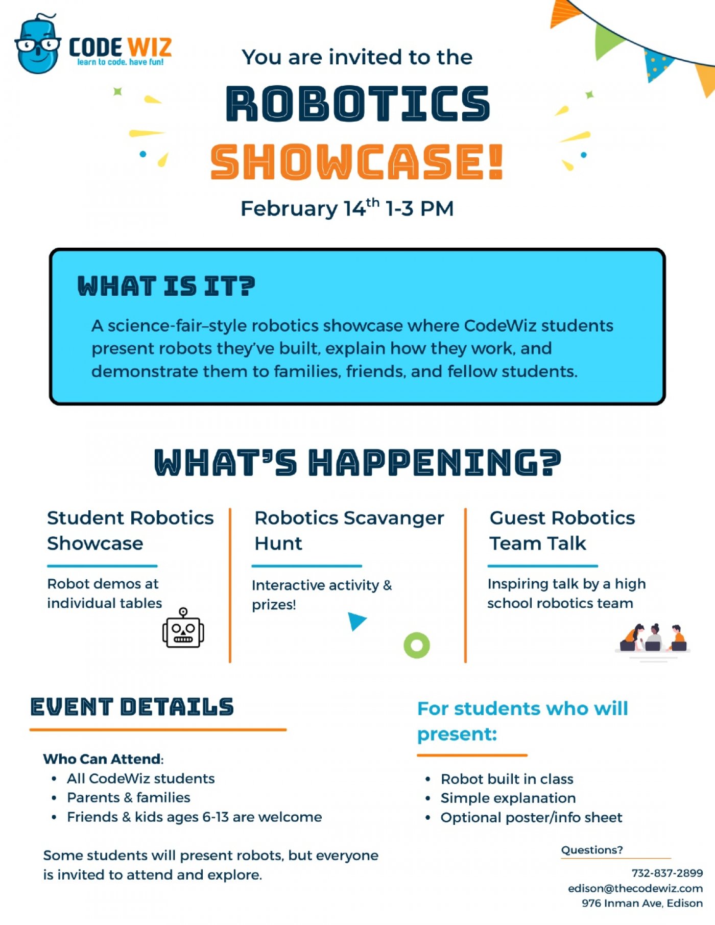 Join CodeWiz Edison for a fun and educational STEM event featuring hands-on activities and student projects. Kids will have the chance to explore robotics, creativity, and problem-solving in an interactive setting.