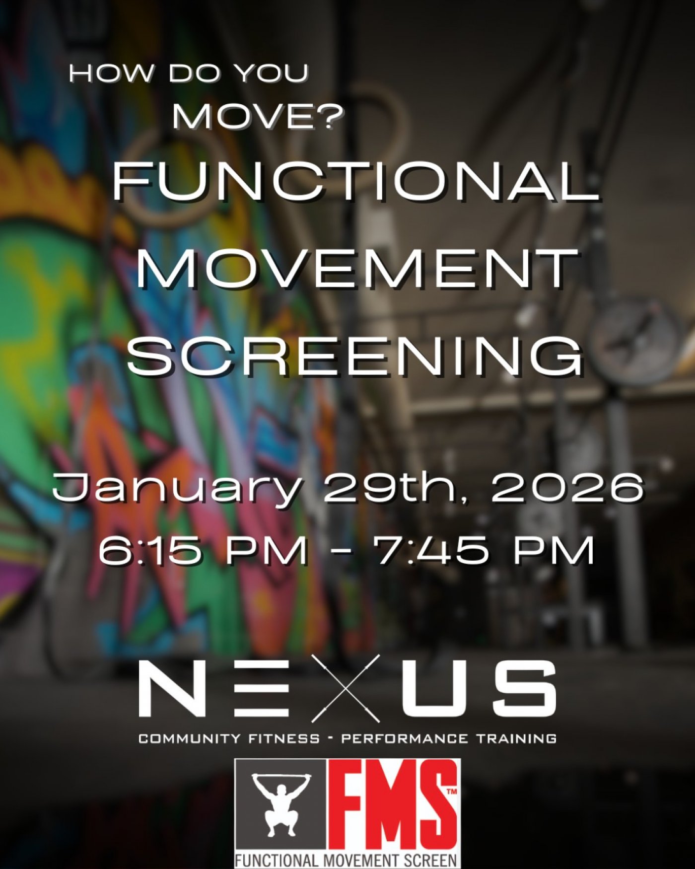 Jan 29th, 6:15pm-7pm, is the FMS, the from 7-7:45pm is the FCS! These are your keys to unlocking hidden habits, building balance, and preventing injuries.