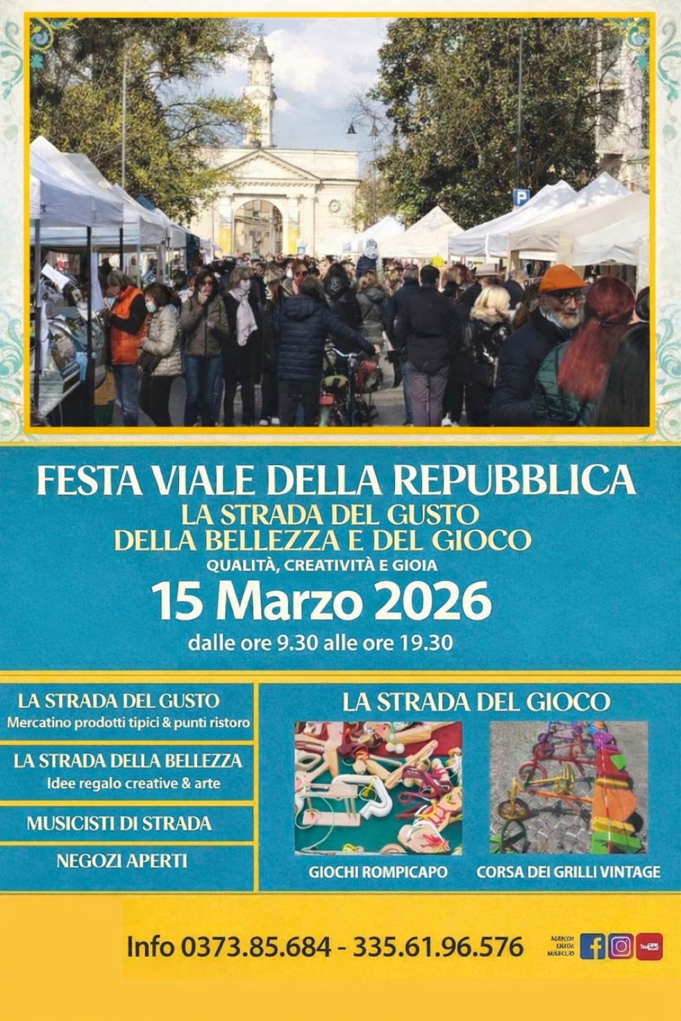 Domenica 15 marzo 2026, dalle ore 9.30 alle 19.30, in Viale Repubblica a Crema, si terrà la 5ª edizione della FESTA DI VIALE REPUBBLICA – “Le Strade del Gusto, della Bellezza e del Gioco”, uno degli appuntamenti più attesi del quartiere di Porta Ombriano.