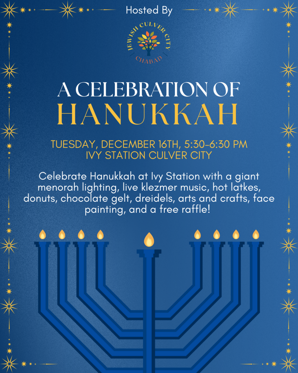Join us on Tuesday, December 16, 2025 at 5:30 PM for a Giant Menorah Lighting at Ivy Station!