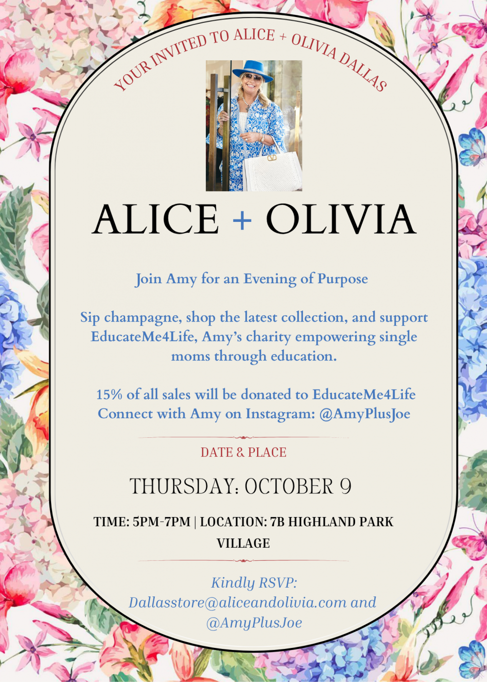 Come by Alice & Olivia in Highland Park Village Thursday October 9th anytime from 5:00 - 7:00 pm for free champagne and to support my charity EducateMe4Life supporting single mom's education. For any questions contact me @amyplusjoe on IG. 7 Highland Park Village Dallas Tx. 75205