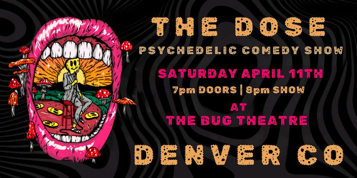 - **Event Description**: A mind-bending journey of experimentation, laughter, and healing. THE DOSE is a vibrant and fully immersive psychedelic comedy experience.About this Eventhttps://youtu.be/run3EdmqzfQ?si=FqpS32WLso2Cr6UYTHE DOSE: A PSYCHEDELIC COMEDY SHOWDoors and Preshow DJ SET 7pm | COMEDY SHOW 8pmAfter last year's SOLD OUT success THE DOSE returns to THE BUG THEATRE in Denver CO. A mind-bending journey of experimentation, laughter, and healing. Set in a vibrant and surreal venue, THE DOSE is a fully immersive psychedelic experience featuring a carefully curated line-up of some of the best comedians in the country (seen on HBO, Comedy Central, Late Night, Netflix, Don’t Tell, and more!).At THE DOSE we facilitate the perfect set and setting for both the comedians and the audience to find the funny within their expanding minds.Our Master of Ceremonies and creator of THE DOSE is Steven Gillespie (CONAN, AMAZON PRIME), a nationally touring stand-up comedian and a psychedelic connoisseur.THE DOSE is more than a comedy show, it’s a multi-media event featuring our very own DJ and he will play before, during, and sometimes even after the show! Don't miss the pre-show DJ set (starts at 7pm doors) featuring music, visuals, vendors and flow performers...its becoming more and more popular!We encourage all types of festival performers to come show off their skills during the pre-show DJ set (Jugglers, Dancers, Hula Hoopers, sound bathers, etc.).If you are interested in performing during the pre-show please email us here...thedosecomedyshow@gmail.comCome take a trip with us as we transcend the ordinary, dance on the edges of perception, and explore the healing properties of our boundless imaginations.And also to just laugh and be silly :)------------------------------------------------------------------TICKETSGeneral Admission - $25 Online | $30 At The DoorThe General Admission ticket gives you guaranteed admission to the show, with seat selection on a first served basis the night of the show upon arrival.VIP SEATING - $35 ONLINE ONLYThe VIP Seating ticket gives you a guaranteed seat at the event in the first three rows of the venue . Your seat will be reserved and held for you no matter what time you make it to the venue. If you want to sit with a group, make sure you buy all of the tickets in one order to guarantee that.-------------------------------------------------------------------DETAILSSaturday April 11th| Doors/Pre-Show  @ 7 PM | Show @ 8 PM | 18+PRE-SHOW DJ SET starts at 7pm---------------------------------------------------------------------ABOUT THE VENUE -- THE BUG THEATRE -- DENVER COThe space was originally built as a nickelodeon movie house in 1912, known at the time as the Ideal Theater. Throughout the century it has also been known as The World Theatre, The Navajo, and The Avalon, and also operated for a time as a Faith Temple Church, before closing in the 60’s and being converted into an appliance storage warehouse. In 1994 it was purchased by local artists Reed Weimer and Chandler Romeo, who incorporated it as a federal 501(c)(3) as “Bug Performance and Media Art Center” and named it The Bug Theatre, a tribute to the nickname the neighborhood kids used to have for the space – the “Bug House”.Since then, The Bug has produced live theatrical performance, forums, classes, and acclaimed monthly showcases featuring local independent film, music and performing artists, as well as bringing national and international artworks to our local audiences in the form of film festivals and traveling artists. It has also served as a multi-functional venue that provides a gathering place for community meetings, workshops, benefits, and other artistic events. The Bug continues to work towards its original mission to make the arts accessible to artists and audiences of all means, with both rental rates and ticket prices below the market “norm” for a space of its kind.  https://cdn-az.allevents.in/events2/banners/286883c0-e70b-11f0-a49b-adc4455cf035-rimg-w1200-h549-dc060204-gmir.jpg   https://cdn-az.allevents.in/events6/banners/28b03b20-e70b-11f0-a49b-adc4455cf035-rimg-w553-h740-dc5f1616-gmir.jpg