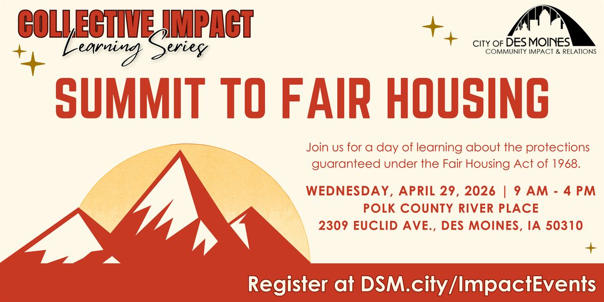 - **Event Description**: Join us for a day of learning about the protections guaranteed under the Fair Housing Act of 1968.About this EventJoin us on Wednesday, April 29, 2025 for the Summit to Fair Housing hosted by the City of Des Moines Community Impact and Relations Department. This event is designed to provide education in understanding the world of fair housing laws and address the current state of affairs under the new guidance of federal protections.This event will bring together the voices of civil rights enforcers, housing providers, and residents of Iowa to hear from subject matter experts in the enforcement of fair housing law at the municipal, state, and federal level. Residents are encouraged to attend and equip themselves with knowledge of their tenant rights in Iowa.Celebrate the enactment of the Fair Housing Act of 1968 with us to commemorate a significant civil rights achievement protecting the right to access housing without discrimination.Speaker information will be announced soon. Interested in being a sponsor? Contact us at CommunityRelations@dmgov.org.Impact PassMake sure to pick up your Impact Pass at the first event you attend. Residents that attend every event will be recognized at the end of the learning series for their contributions in learning how to spark an impact in our community. Don't have one? No worries! Passes will be available at each event and can be sent via mail or email.This event is part of the Community Impact &amp; Relations Department's Collective Impact Learning Series. To learn more, visit DSM.city/ImpactEvents.