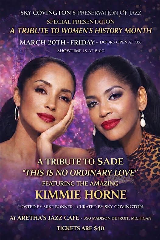 - **Event Description**: Join us for a soulful celebration of Sade with Kimmie Horne at an intimate jazz cafe setting.About this EventSky Covington’s Preservation of Jazz Presents a Special Women’s History Month Tribute to SadeDetroit, MI — This Women’s History Month, internationally celebrated jazz vocalist and producer Sky Covington proudly presents an unforgettable evening of elegance, soul, and timeless music with a special tribute to the iconic Sade.Taking place Friday, March 20, at the legendary Aretha's Jazz Cafe, this sophisticated presentation will feature the extraordinary Kimmie Horne, whose velvety tone, commanding stage presence, and deep connection to the jazz tradition make her the perfect artist to honor one of music’s most beloved voices.Guests can expect an evening rich in atmosphere and artistry as Horne delivers a heartfelt tribute celebrating Sade’s signature blend of jazz, soul, and quiet storm — music that has defined romance and refinement for generations.The evening will be hosted by renowned Detroit entertainer Mike Bonner and carefully curated by Sky Covington, whose Preservation of Jazz series continues to bring world-class performances to the heart of Detroit.Event DetailsSky Covington’s Preservation of JazzSpecial Presentation: A Tribute to Women’s History MonthFriday, March 20Doors Open: 7:00 PMShowtime: 8:00 PMAretha’s Jazz Cafe350 Madison AvenueDetroit, MichiganTickets: $40About SadeSade Adu, known simply as Sade, is one of the most distinctive and influential vocalists in modern music. Rising to international acclaim in the 1980s, she captivated audiences with her smooth contralto voice and understated yet emotionally powerful delivery.With timeless hits such as “Smooth Operator,” “Sweetest Taboo,” and “No Ordinary Love,” Sade created a sound that effortlessly fused jazz, soul, pop, and R&amp;B. Her music is celebrated for its elegance, emotional depth, and sophistication — qualities that continue to inspire artists across generations.Sade’s artistry has earned multiple Grammy Awards and global recognition, establishing her as a symbol of musical refinement and enduring style.About Kimmie HorneDetroit native Kimmie Horne is an internationally respected jazz vocalist whose career reflects both heritage and innovation. As the niece of legendary songstress Lena Horne, she carries forward a rich musical lineage while carving her own distinctive path.Known for her lush tone, interpretive brilliance, and magnetic stage presence, Horne has performed on prestigious stages around the world and remains a beloved figure in Detroit’s vibrant jazz community. Her ability to connect deeply with audiences makes every performance both intimate and unforgettable.For this special tribute, Horne brings her signature grace and vocal mastery to the music of Sade — promising a performance filled with passion, beauty, and musical excellence.About Sky Covington &amp; The Preservation of JazzSky Covington is an award-winning jazz vocalist, cultural curator, and founder of The Preservation of Jazz, an organization dedicated to honoring the legacy of jazz while creating meaningful performance opportunities for today’s artists.Through thoughtfully produced tributes and concert experiences, Covington continues to elevate Detroit’s standing as a global destination for world-class jazz.Media Contact:Sky Covington248-383-3385nicolefreemanmanagement@gmail.com  https://cdn-az.allevents.in/events2/banners/22bb9010-08e0-11f1-8e72-eb9923d9d6b2-rimg-w493-h740-dc1b162f-gmir.jpg