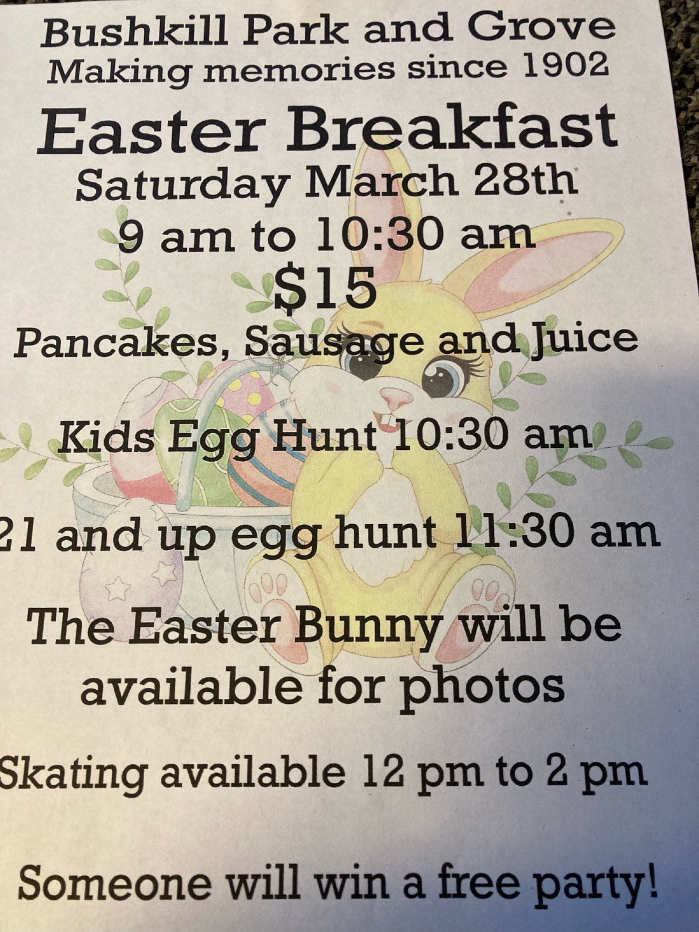 Come to Bushkill Amusement Park and Roller Skating Rink for their family fun event Rain or Shine! $15-- per person includes Breakfast from 9 am to 10:30 & Photos with the Easter Bunny ~~ 10:30 Children's Easter Egg Hunt w 1 lucky child winning a $225-- skate party & All Eggs will be filled so no one goes home empty handed ~~ 11:30 An adult 21 years old & older Egg Hunt ~~ Noon to 2 pm roller skating & skate rentals are included with the price. Call 610--258-6941 for more information.