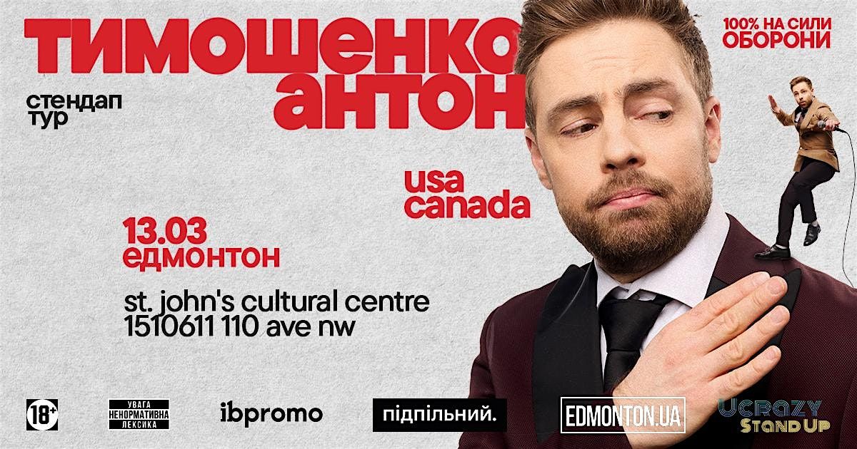 - **A:** Антон Тимошенко - Edmonton takes place on Fri, 13 Mar, 2026 at 07:00 pm to Fri, 13 Mar, 2026 at 09:30 pm at St. John's Cultural Centre, 10611 110 Avenue Northwest, Edmonton, Canada.