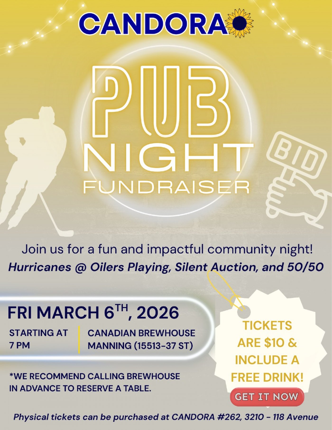 Join us for a fun and impactful community night on Friday, March 6th starting at 7PM at Canadian Brewhouse Manning (15513–37 St). The Hurricanes vs. Oilers game will be taking over the screens and we'll have a game night 50/50, PLUS high-ticket silent auction items for you to bid on all for a great cause!