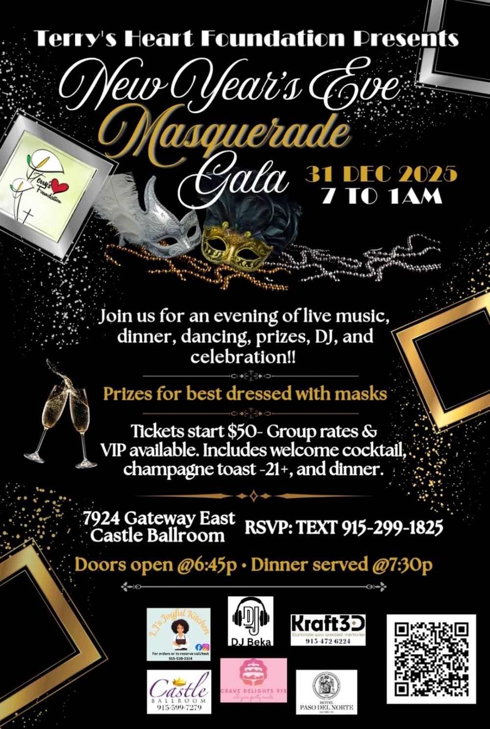 Terry's Heart Foundation is hosting it's biggest event to date!!! Our New Year's Eve Masquerade Gala!!!🎉 Come out and enjoy a safe environment to have an amazing time and celebrate the New Year!! We thought of everything to ensure your night is unforgettable. Come make memories with us as we welcome 2026!!😊💕 Wear your best and don't forget your mask to win the Best Dressed prize!!🎭