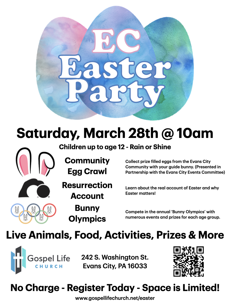 You're invited to join our community-wide event for kids up to age 12, rain or shine, starting at 10am on Saturday March 28th. Collect prize-filled eggs from the Evans City Community with your guide bunny (presented in partnership with the Evans City Events Committee), learn the real account of Easter and why Easter matters, and compete in the annual ‘Bunny Olympics’ with numerous events and prizes for each age group.