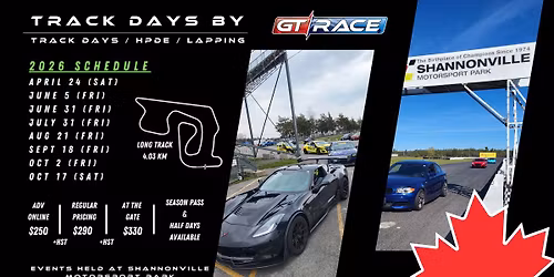 Public car track day at Shannonville Motorsport Park. (4.03km Long Circuit) Register here: https://www.gtrace.ca/trackdays Format: 3 Run Groups (Nov, Int, Adv) You will get 7 runs x 20 minutes each Point by Passing rules apply in passing zones Marshals... Read More