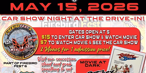 We will be hosting a Car Show at the Drive In on May 15, 2026! It will be part of Firebird Fest 6! Come to the Drive-In to enter or just be a spectator at the show. $7 gets you in to spectate and see 2 movies. $15 enters you into the show and to see 2... Read More