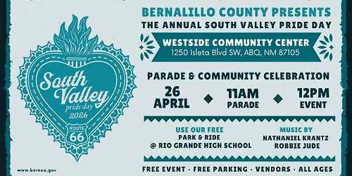 It's one of our favorite days of the year... The annual South Valley Pride Day Celebration is BACK on Sunday, April 26! >>> bernco.gov/district-2/south-valley-pride-day Come join the fun, beginning with a parade at 11 a.m. followed by fiesta ac... Read More