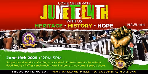 Heritage, History, & HopeAbout this Event"One generation commends your works to another; they tell of your mighty acts." (Psalms 145:4 NIV)Welcome to the FBCoG Annual Juneteenth Festival... Read More