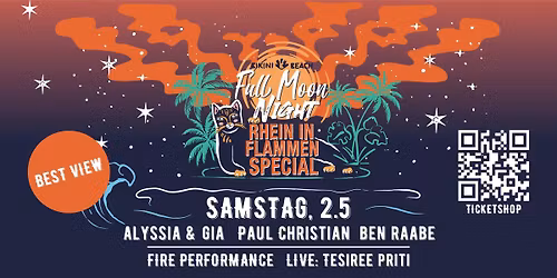 Feiert mit uns das vorerst letzte "Rhein in Flammen" und geniesst das große Feuerwerk von eurem Logenplatz am Beach. Auf unserem "Full Moon Night" - Special erwarten euch mehrere DJs, Fire Artists, Live Music und Lichtinstallationen ! DJs: Ben Raabe Aly... Read More