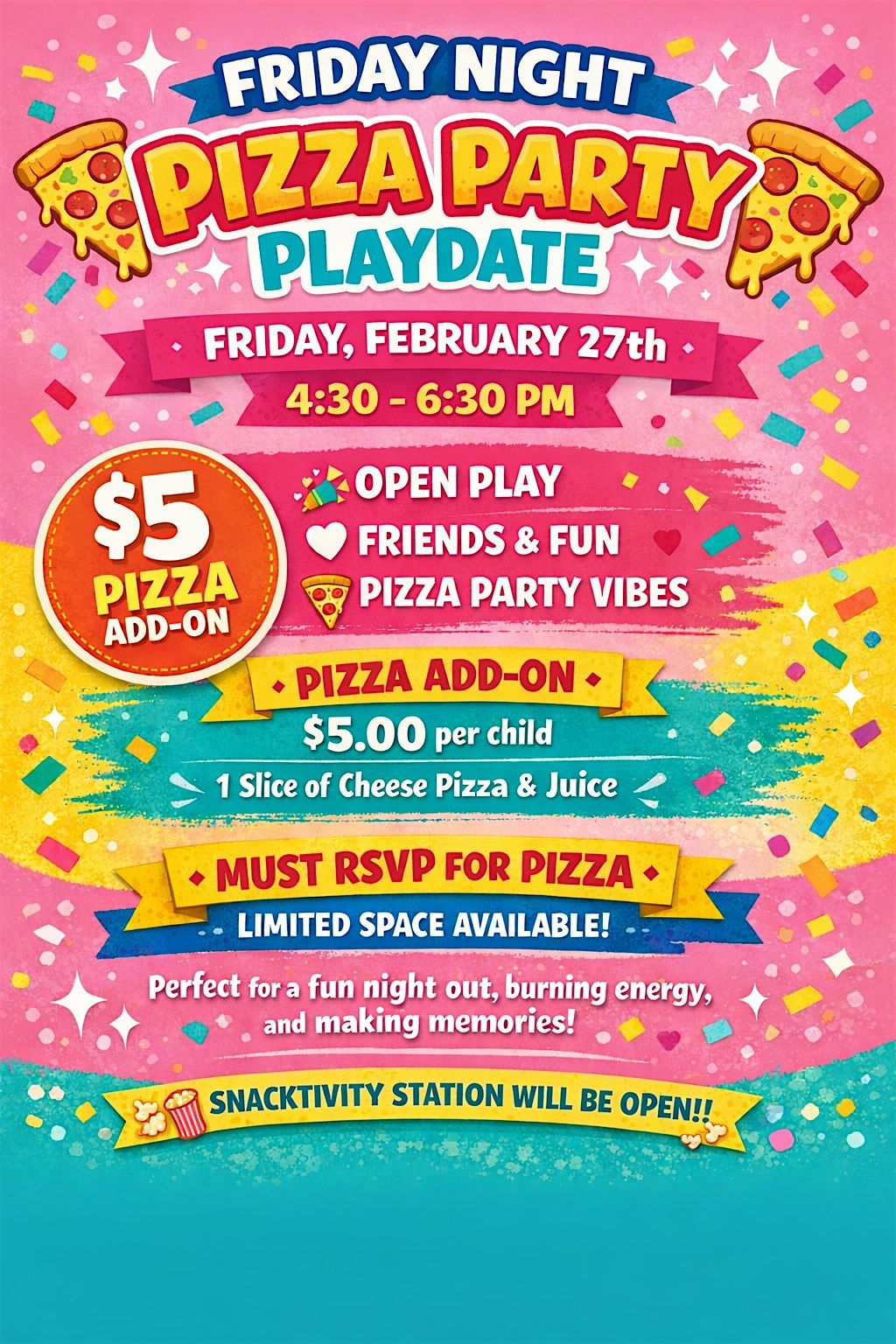 - **Event Description**: Get ready to indulge in a delicious cheesy slice of heaven at our Friday Night Pizza Party - it's gonna be a saucy good time!About this EventJoin Us for the Friday Night Pizza Party!Come and enjoy a fun evening at Little Wanderers Sensory Play on February 27, 2026 at 4:30 PM. We're hosting a pizza party where you can relax, mingle, and indulge in delicious slices of pizza. It's the perfect way to kick off the weekend with good food and great company. Don't miss out on this tasty event! Ticket its a reserve for pizza and your play spot you can pay the rest at the door  https://cdn-az.allevents.in/events2/banners/b16a6aa0-0ad1-11f1-b6c3-c3694e9a4e40-rimg-w493-h740-dc13a8b7-gmir.jpg