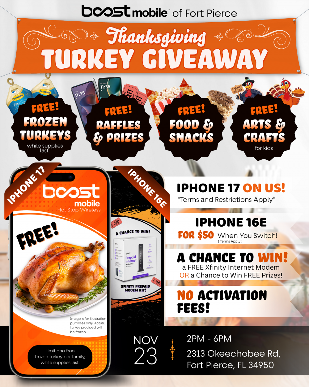 - **Event Description**: ? Stop by a Boost Mobile store to grab a FREE Turkey for your Thanksgiving Dinner this holiday season! ?️Don’t wait — this limited-time offer is first come first served! ? While supplies last (200+ Turkeys)!? Join us for an exciting Thanksgiving Event by Boost Mobile! ?Gather with us to celebrate the season of gratitude with fun and freebies! ??We’re thrilled to offer:? Free Turkey: The first 200 families can receive a turkey to enjoy this Thanksgiving!??? Free Food: Savor delicious snacks including pizza cookies and popcorn throughout the event!?️? Free Raffles: Don’t miss your chance to win amazing prizes in our free raffle giveaways!?? Live Music: Enjoy live entertainment while you celebrate with family and friends!?‍?‍?‍? Bring your loved ones for a day full of fun and community spirit!Let’s make this Thanksgiving memorable together! ?❤️See you there! ?⚠️ Restrictions Apply / See Store For Full Details!? Date: Sunday November 23 2025⏰ Time: 2:00 P.M. - 6:00 P.M.? Location: Boost Mobile — 2313 Okeechobee Road Fort Pierce FL 34950? Family Must Be Present (1 Turkey Per Family)