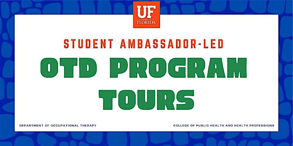 - **Event Description**: Learn all about the University of Florida Occupational Therapy Doctorate program from our OTD Student Ambassadors!About this EventJoin an in-person tour of the University of Florida's Department of Occupational Therapy, led by current student leaders, OTD Ambassadors. Ask questions, check out our facilities, and learn about the entry-level Occupational Therapy Doctorate program’s application and admission process. OTD Ambassadors will share their experiences and build your excitement for all things occupational therapy! Family and friends are welcome to register and attend with you as well. Additional location information and parking details will shared upon registration.Contact InformationEmail: OTAdmissions@phhp.ufl.eduPhone: (352) 273-6817https://youtu.be/9JIgK0fRHJ8?si=WGNN7WMqznT34Df2