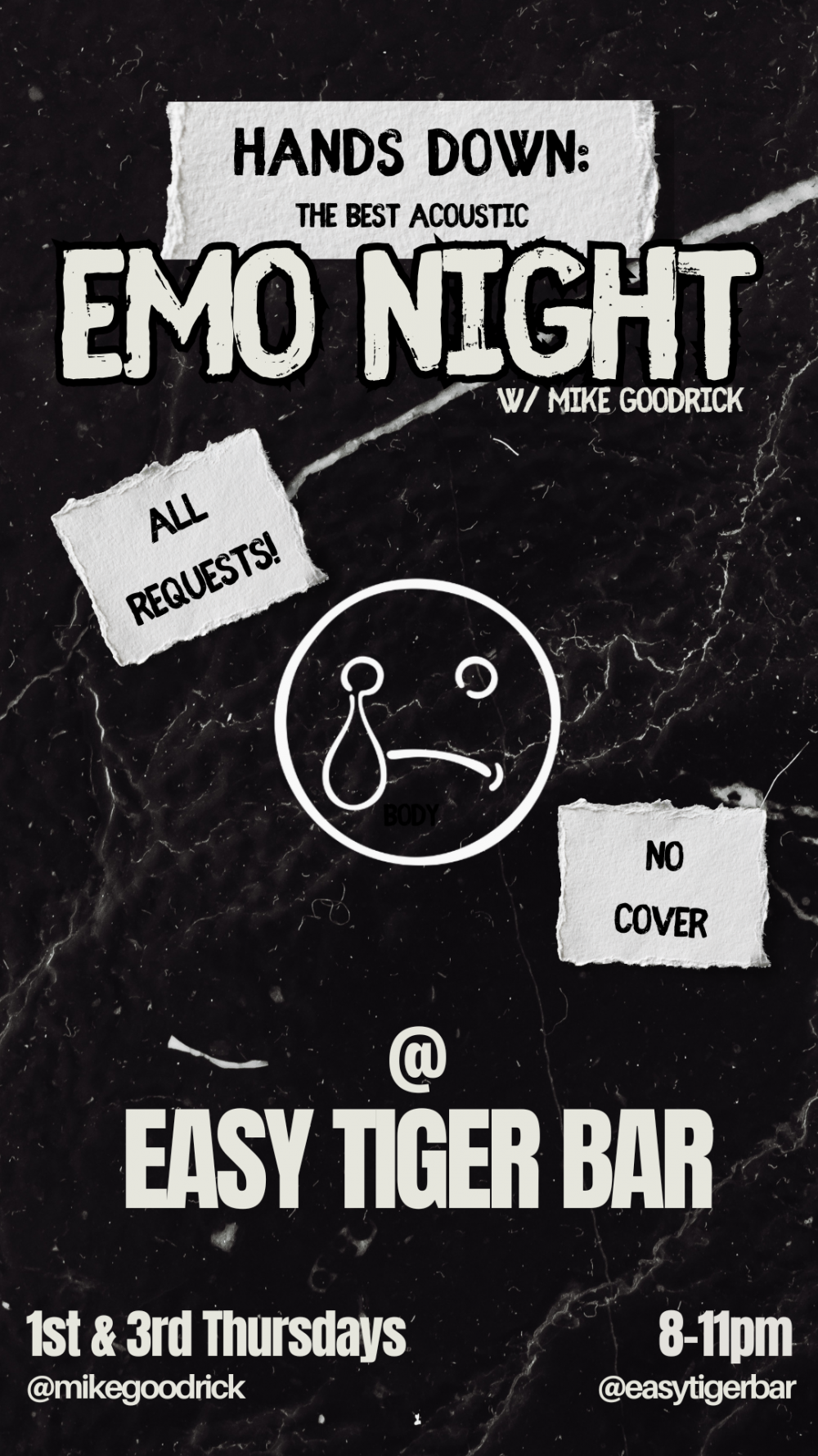 Join us every 1st and 3rd Thursday at Easy Tiger Bar in Glendale for a night of all-request acoustic emo anthems from 8-11 PM! 🎸✨
