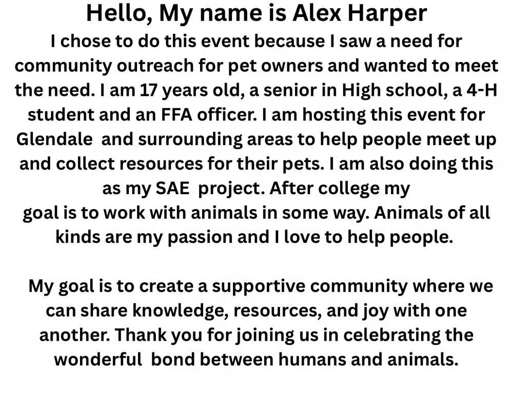 “I chose to do this event because I saw a need for community outreach for pet owners and wanted to meet the need. I am hosting this event for Glendale and surrounding areas to help people meet up and collect resources for their pets. Thank you for joining us in celebrating the wonderful bond between humans and animals.”
