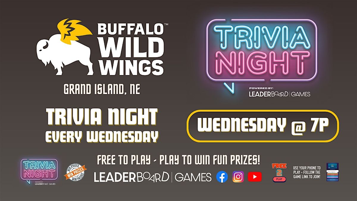 - **Event Description**: Trivia Night at Buffalo Wild Wings - Grand Island NE - WEDNESDAYS at 7p. Bring your best team and play! FREE to play and WIN PRIZES!About this EventTrivia Game Night at Buffalo Wild Wings - Grand Island NE every WEDNESDAY at 7pm! Test your knowledge, compete for prizes, and enjoy a fun-filled evening of trivia and laughter with your team. Free to Play - have to Play to WIN PRIZES!Trivia Night features an interactive trivia game format, with a mix of rounds including image round and music round in every show. The event is hosted live in person by one of our super fun Game Hosts. Teams &amp; players use their phone to play by following the game link to submit answers and get points, making it easy to play and fun for all.What to expect:Engaging Trivia Rounds: Dive into diverse trivia topics from pop culture to history.Team-Based Challenge: Join forces with friends for collaborative trivia fun.Prizes Galore: Compete for fabulous rewards and aim for the top spot.Lively Atmosphere: Experience a night of friendly competition and camaraderie.Don't miss this thrilling trivia extravaganza! Get your best team together, Free to Play but you have to Play to Win!!!#trivia #triviagame #TriviaNight #GameNight #QuizTime #BrainTeasers #ThinkAndWin #SmartIsTheNewSexy #TestYourKnowledge #MindGames #ChallengeYourMind #QuizNight #TriviaChallenge #GameOn #TeamTrivia #TriviaMaster #TriviaTuesday #freetoplay #grandisland #nebraska #NE #bww #buffalowildwings#LeaderBoardGames  https://cdn-az.allevents.in/events2/banners/79ae2a90-f81e-11f0-b5db-bf22a0ebdfc2-rimg-w740-h740-dc4d4744-gmir.jpg