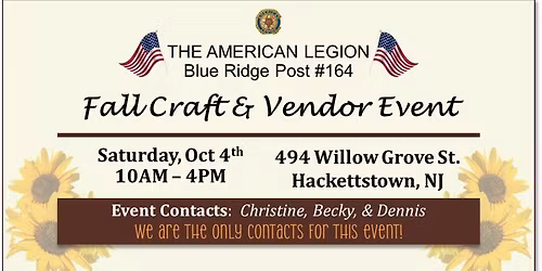 - American Legion - Fall Craft & Vendor Event is hosted at "494 Willow Grove St, Hackettstown, NJ 07840-1856, United States".