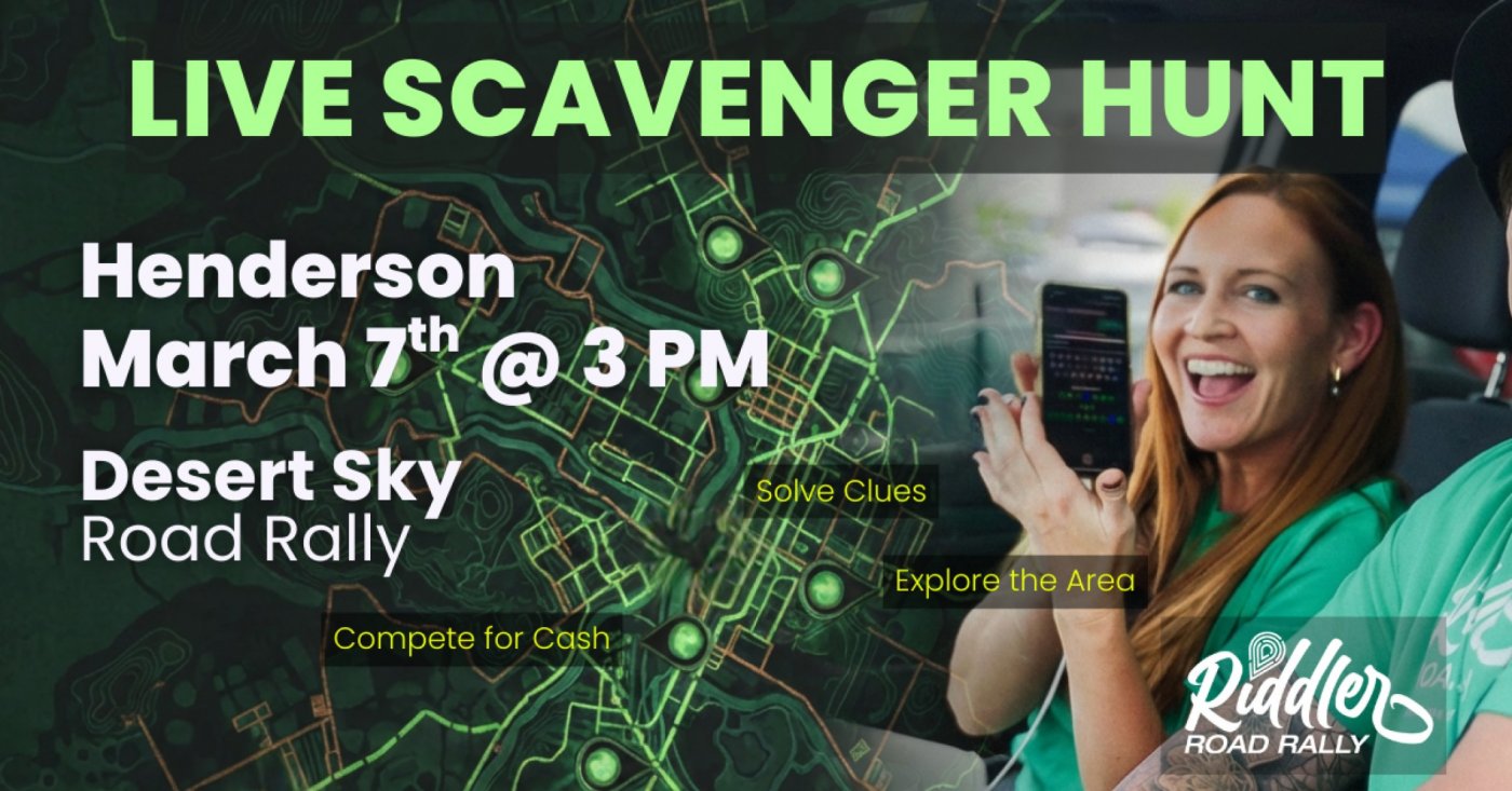 The Desert Sky Road Rally launches you into an adventure across Henderson, sending you through the city streets to local landmarks and hidden gems. Follow GPS-guided routes as you solve each riddle, pushing closer to the finish with every puzzle and quick decision. Play solo or gather a team of up to five. 10% of every entry fee fuels a growing cash jackpot with a $500 minimum, split 60/25/15 among the top three teams. From wide-open skies to unexpected discoveries, every turn brings a new surprise—and a chance to climb the leaderboard under the Nevada sun.