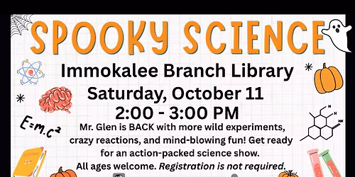 - Spooky Science at Immokalee Branch Library is hosted at "417 N 1st St, Immokalee, FL 34142-3150, United States".